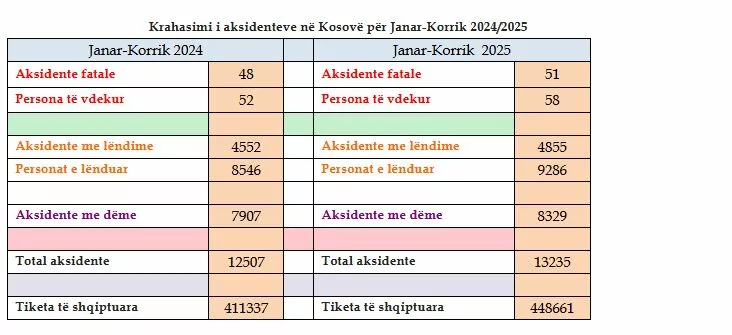 Sipas të dhënave nga Policia e Kosovës, gjatë periudhës janar–korrik 2025 janë regjistruar 51 aksidente fatale, krahasuar me 48 në të njëjtën periudhë të vitit 2024.