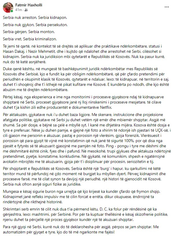 “Serbia nuk arreston, Serbia kidnapon. Serbia nuk gjykon, Serbia persekuton. Serbia gënjen, Serbia monton. Serbia vret, Serbia kriminalizon. Të jemi të qartë, në kontekst të së drejtës së aplikuar dhe praktikave ndërkombëtare, statusi i Hasan Dakaj, i Nezir Mehmetit, dhe i kujtdo që ndalohet dhe arrestohet në Serbi, cilësohet si kidnapim. Serbia nuk ka juridiksion mbi qytetarët e Republikës së Kosovës. Nuk ka pasur kurrë, nuk do të ketë asnjëherë”, ka shkruar Haxholli.