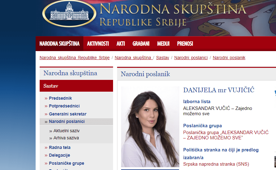 E Danijela Vujiçiq është deputete në Kuvendin e Serbisë nga radhët e partisë së presidentit të Serbisë, Aleksandar Vuçiq.