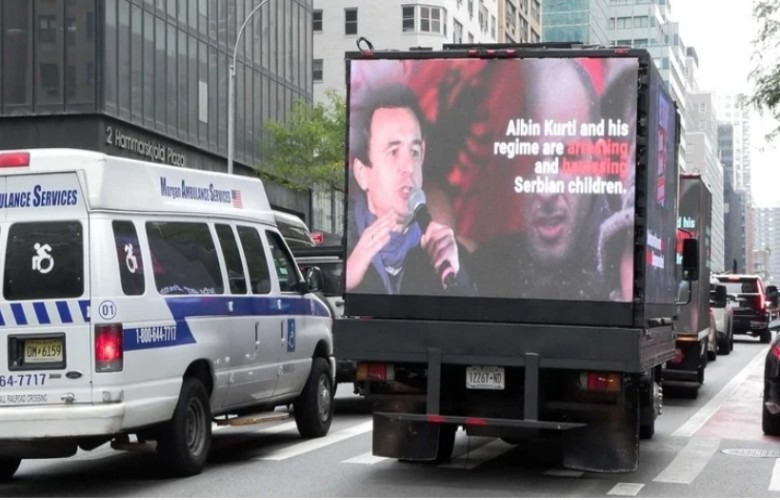 Tre kamionë me tabela reklamuese kundër Kosovës dhe kryeministrit në detyrë Albin Kurti po qarkullojnë këto ditë në rrugët jashtë selisë së Kombeve të Bashkuara në New York, aty ku po mbahen seancat e Asamblesë së Përgjithshme.