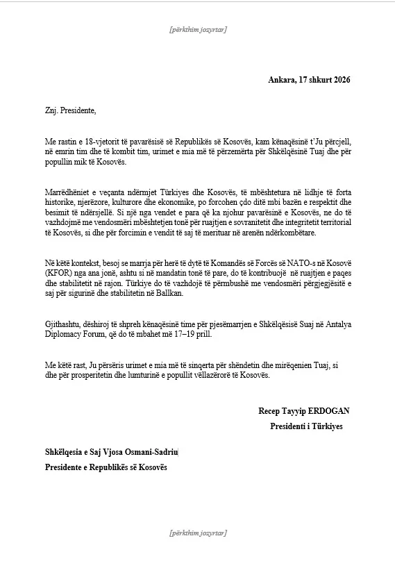 Presidenti i Turqisë, Recep Tayyip Erdogan, i ka dërguar një letër urimi presidentes së Republikës së Kosovës, Vjosa Osmani-Sadriu, me rastin e 18-vjetorit të shpalljes së Pavarësisë së Kosovës, transmeton KosovaPost.