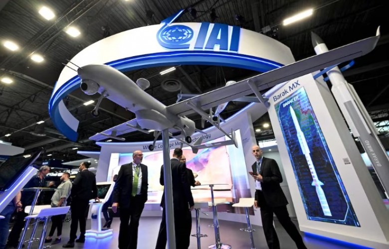 Struktura të mëdha të zeza janë ngritur rreth stendave të pesë kompanive izraelite, përfshirë Israel Aerospace Industries (IAI), Rafael dhe Elbit Systems.