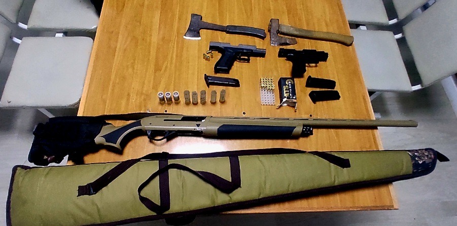 Gjatë kontrollit të realizuar në vendngjarje, tek të dyshuarit D. F. 40 vjeç dhe U. A., 25 vjeç, janë gjetur dhe konfiskuar armë dhe municione: 1 pushkë gjahu me 3 fishekë dhe 5 gëzhoja, 1 revole me 2 karikatorë dhe 23 fishekë, 1 revole me 1 karikator dhe 5 fishekë dhe 2 sopata.