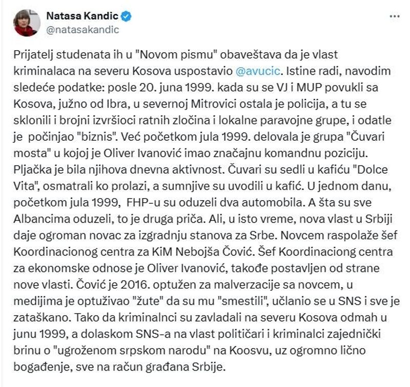 Sipas saj, me ardhjen në pushtet të SNS-së (Partia Progresive Serbe), lidhjet mes politikanëve dhe strukturave kriminale vetëm janë forcuar, “në emër të mbrojtjes së popullit serb në Kosovë, por me pasurim të madh personal, në kurriz të qytetarëve të Serbisë”.