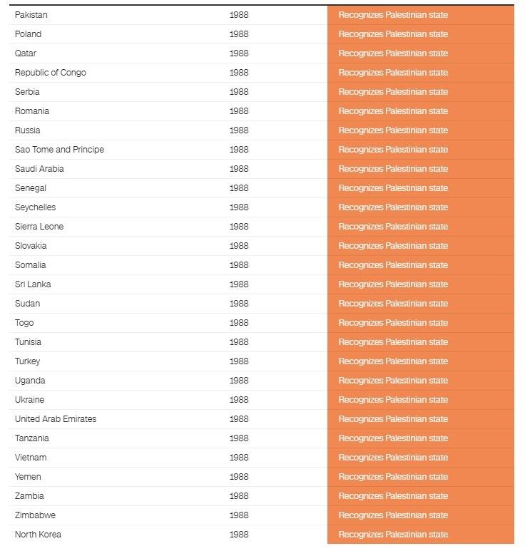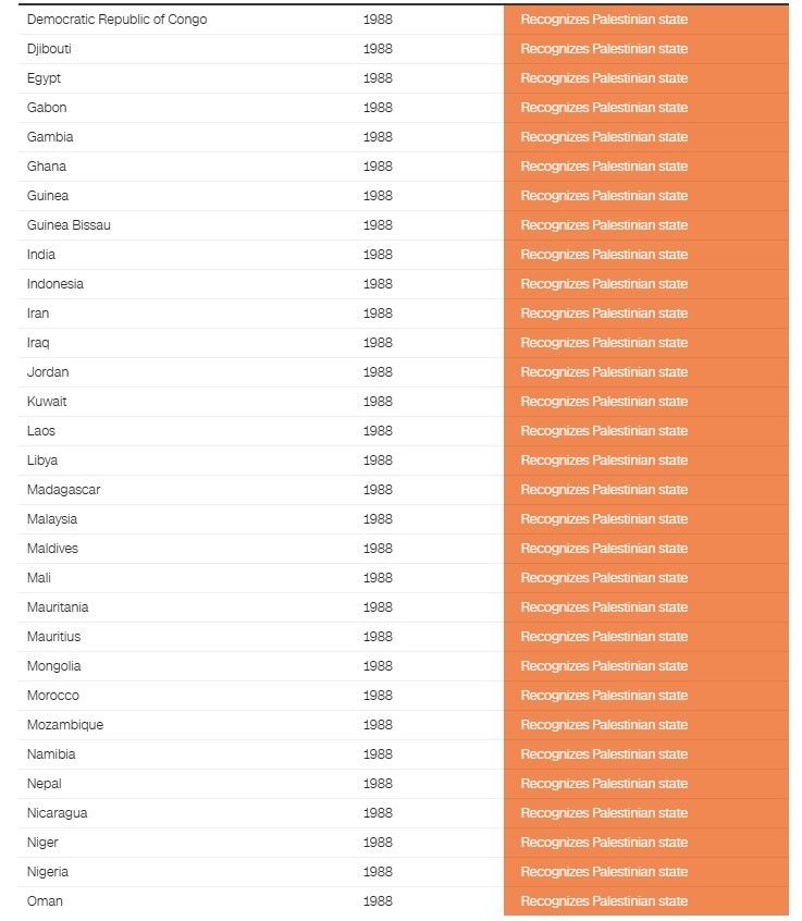Pjesa më e madhe e këtyre shteteve e kanë njohur zyrtarisht shtetin palestinez që në vitet 1980, menjëherë pas shpalljes së pavarësisë nga ana e Këshillit Kombëtar Palestinez (PNC), i cili është organi përfaqësues i Organizatës për Çlirimin e Palestinës (OÇP).