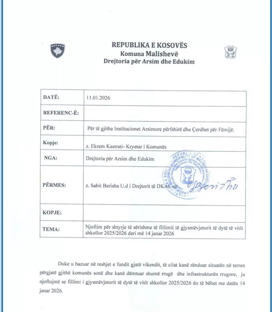 Komuna e Malishevës ka njoftuar se mësimi në shkollat e kësaj komune shtyhet deri më 14 janar.