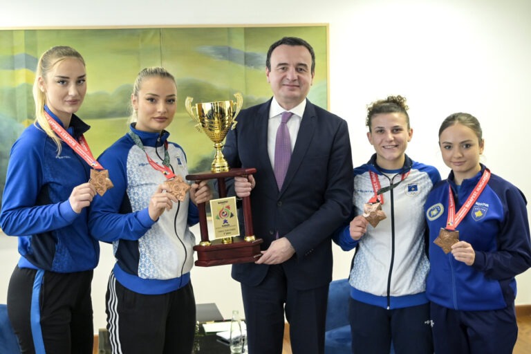 Kryeministri i Republikës së Kosovës, Albin Kurti, bashkë me zëvendësministren e Kulturës, Rinisë dhe Sportit, Daulina Osmani ka pritur sot në takim ekipin e Kosovës në karate, në konkurrencën e vajzave, i përbërë nga Fortesa Orana, Vlera Qerimi, Hatixhe Zejnullahu dhe Albulena Gervalla, i cili ka fituar medalje të bronztë në Kampionatin Botëror të Karatesë, që u mbajt nga 24-29 tetor në Budapest të Hungaris.