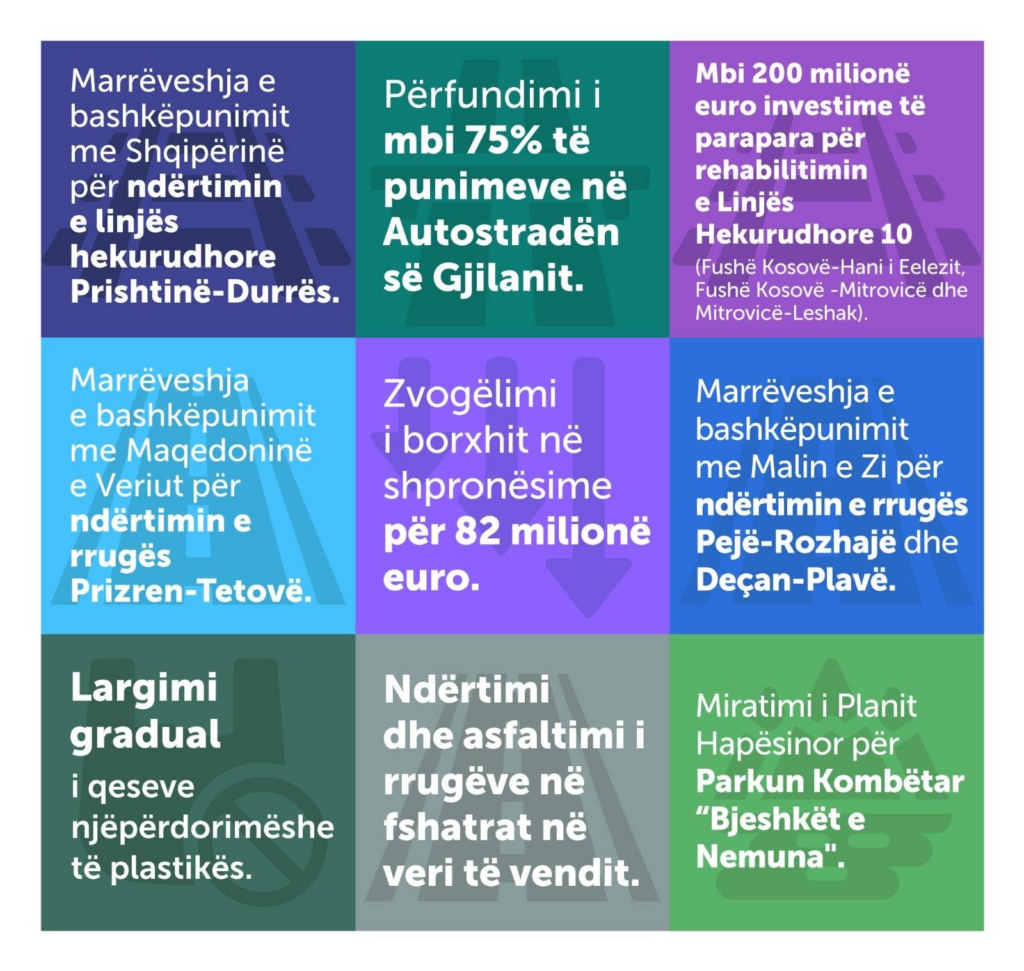 Pas përfundimit të procedurave të shpronësimit, punimet në rrugën Prishtinë – Podujevë tash e disa muaj po vijojnë me intensitetin meritor. Për përfundimin e rrugës Prishtinë – Mitrovicë, e cila ka filluar në vitin 2009 dhe është përcjellë me shumë shkelje dhe keq menaxhim, tashmë kemi përzgjedhur kompaninë mbikëqyrëse ndërkombëtare dhe jemi afër përzgjedhjes së kontraktorit i cili do të bëjë ndërtimin e rrugës. Gjithashtu, jemi angazhuar maksimalisht për gjetjen e zgjidhjes së problemeve pronësore në mënyrë që gjatë vitit të ardhshëm ta përfundojmë aksin rrugor Dollc – Gjakovë. Jemi në fazën para nënshkrimit të kontratave për rrugën Kijevë – Dollc dhe kemi ndarë buxhetin për të vazhduar vitin tjetër me segmentin nga Dollci e deri në Zahaq. Kemi filluar procedurën e prokurimit për ndërtimin e rrugës nga dalja jug e autostradës në Prizren e deri në hyrje të tunelit të rrugës Prizren – Tetovë si dhe ndërtimin e rrugës nga fshati Kërstec në komunën e Sharrit e deri në fshatin Zapod të Bashkisë së Kukësit. Jemi afër përfundimit të urës në Drelaj dhe kemi filluar procedurat e prokurimit për ndërtimin e urave në Badoc e Rogovë të Hasit. Të gjitha këto janë bërë, e për më shumë gjatë qeverisjes tonë kemi ulur borxhin e shpronësimeve për 82 milionë euro.