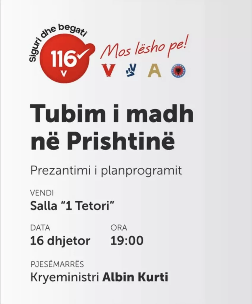 Prishtinë do të mbahet një tubim ku do të bëhet prezantimi zyrtar i planprogramit para qytetarëve nga Lëvizja Vetëvendosje.