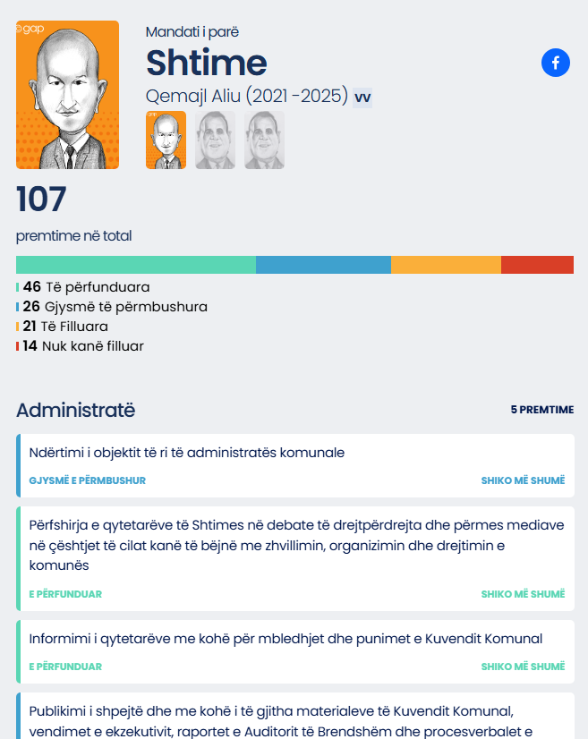 Në këtë publikim, veçanërisht bie në sy Komuna e Shtimes, ku kryetari Qemajl Aliu (LVV) ka përmbushur thuajse të premtimet e dhëna, duke u renditur si një ndër kryetarët me performancën më të lartë në Kosovë.