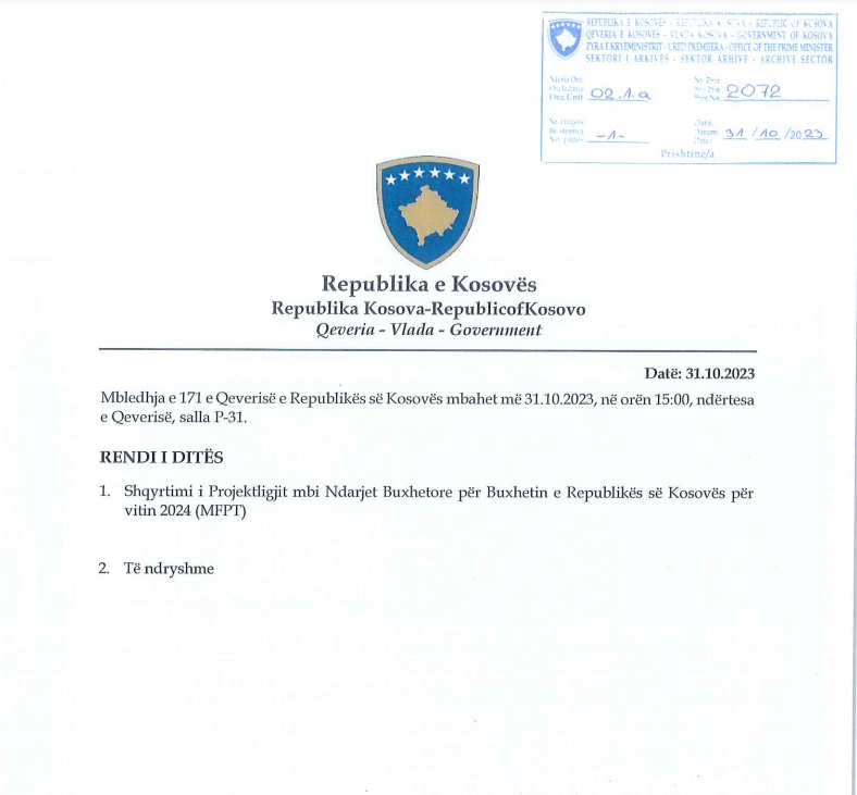 Sipas njoftimit, në rend të ditës për shqyrtim është vetëm Projektligji mbi Ndarjet Buxhetore për Buxhetin e Republikës së Kosovës për vitin 2024, duke mos përjashtuar edhe ndonjë që mund të futet gjatë mbajtjes së mbledhjes.