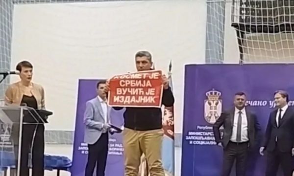 “Me rastin e ngjarjes në sallën e sportit në Kurshumli, më 3 nëntor, kur një burrë pesëdhjetë e dy vjeçar, pas pranimit të memorialit të veteranit që ia dhuroi ministri i Punës, Veteranëve dhe Çështjeve Sociale, Nikolla Selakoviq. , shfaqi një pankartë ku shkruhej “Kozmeti është Serbi, Vuçiq është tradhtar”, duke pasur parasysh se në demonstratën në sallën e sportit morën pjesë rreth 450 persona dhe se dyshohej se veprimet e personit të përmendur kishin elemente të për veprën penale të shkaktimit të panikut dhe çrregullimit, zyrtarët policorë të stacionit policor në Kurshumli e kanë njoftuar Prokurorinë Themelore Publike kompetente, e cila ka urdhëruar që me të të mbahet intervistë për mbledhjen e informatave”, njofton MPB.