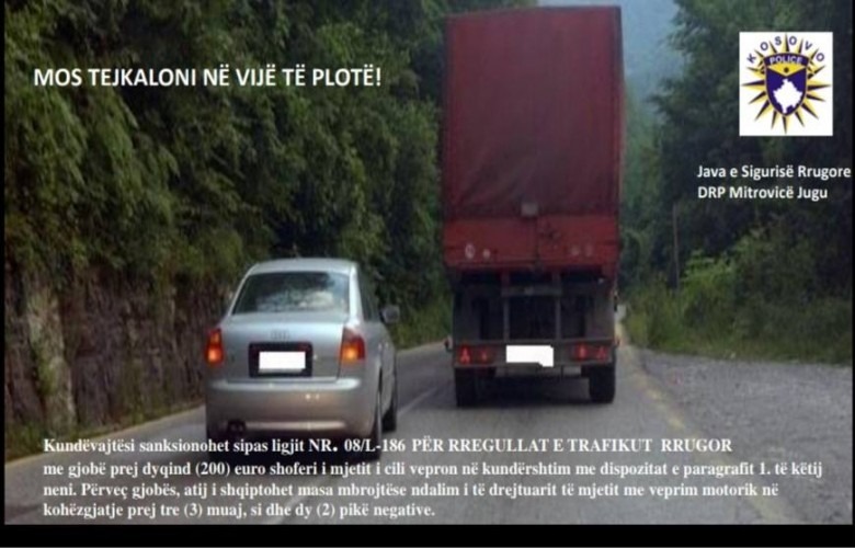 “Kjo fushatë, në fokus ka vetëdijesimin e shoferëve për rrezikun qe paraqet tejkalimi në vijë të plotë pasi që një veprim i tillë rrezikon drejtpërdrejt shoferin që ndërmerr një veprim të tillë por edhe pjesëmarrësit tjerë në trafik duke rrezikuar shkaktimin e aksidenteve me pasoja të rënda”, thuhet në njoftim.