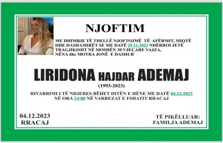 “Njoftim mortor nga familja Ademaj. Familja Ademaj njofton miq, shokë e dashamir se rivarrimi i vajzës tonë Liridona Ademaj e vrarë me datën 29.11.2023 bëhet nesër me datë 4 dhjetor 2023 në varrezat e fshatit Rracaj në ora 14:00”, thuhet në njoftimin e faqen zyrtare të fshatit Rracaj.