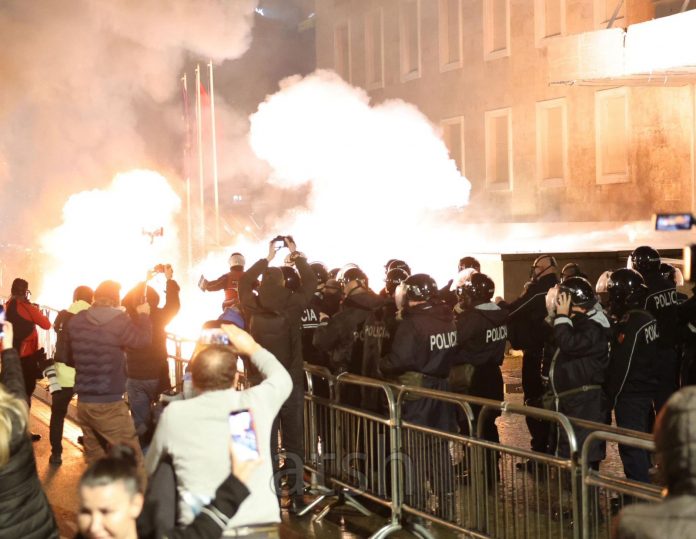 Sipas policisë, efektivi ka mbetur i lënduar nga hedhja e bombave molotov, lëndëve piroteknike dhe sendeve të forta.