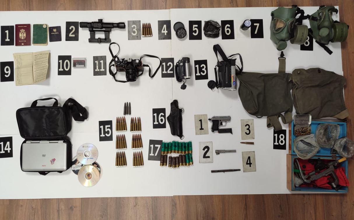 Sipas njoftimi bëhet e ditur se janë sekuestruar: 56 fishekë të kalibrave të ndryshëm, municion për pushkë ajrore, 1 optik për armë të gjatë, 1 kuti për mbushje të municionit, 1 fotrollë për pistoletë, 2 gaz-maska, 2 video-kamera dhe 1 video-kasetë e vogël, dokumente të ndryshme, 1 foto-aparat, 1 lexues (DVD), 1 vulë të rrumbullakët.