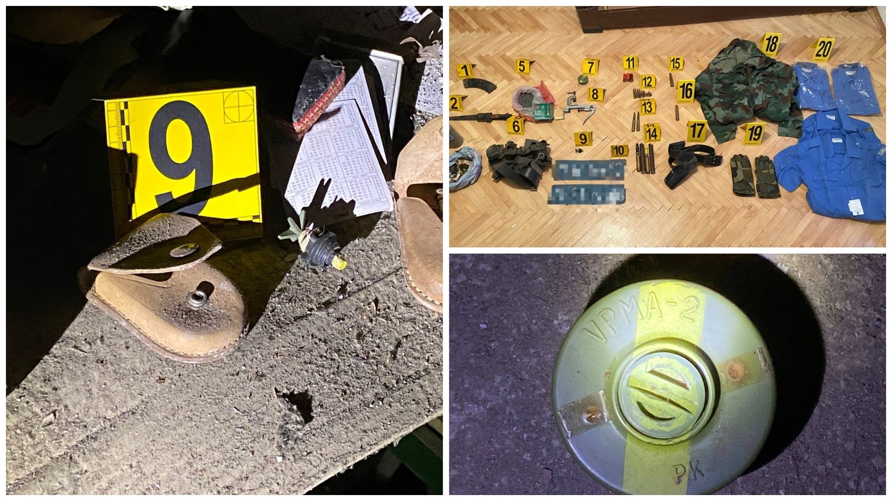 Sipas Policisë, aty janë gjetur “Një karikator të zbrazet për armë të gjatë; Një bajonetë; Shishe plastike e mbushur me saqme; Kapsula për fishek; Sasi e barutit; Një rrip brezi ushtarak; Një minë kundër këmbësorie; Pjesë për mbushje të fishekëve; Detonator për mina; Targa të automjetit të ish-Milicisë; Tre fishekë të armës së gjuetisë; Trembëdhjetë (13) fishekë të kalibrave të ndryshëm; Dy (2) fishekë të kalibrit 12.7 mm; Dy (2) fishekë të kalibrit 20 mm; Dy (2) gëzhoja të kalibrit 12.7 mm; Një xhaketë ushtarake dimërore; Një palë doreza ushtarake; dhe, Katër këmisha të Policisë së Serbisë”.