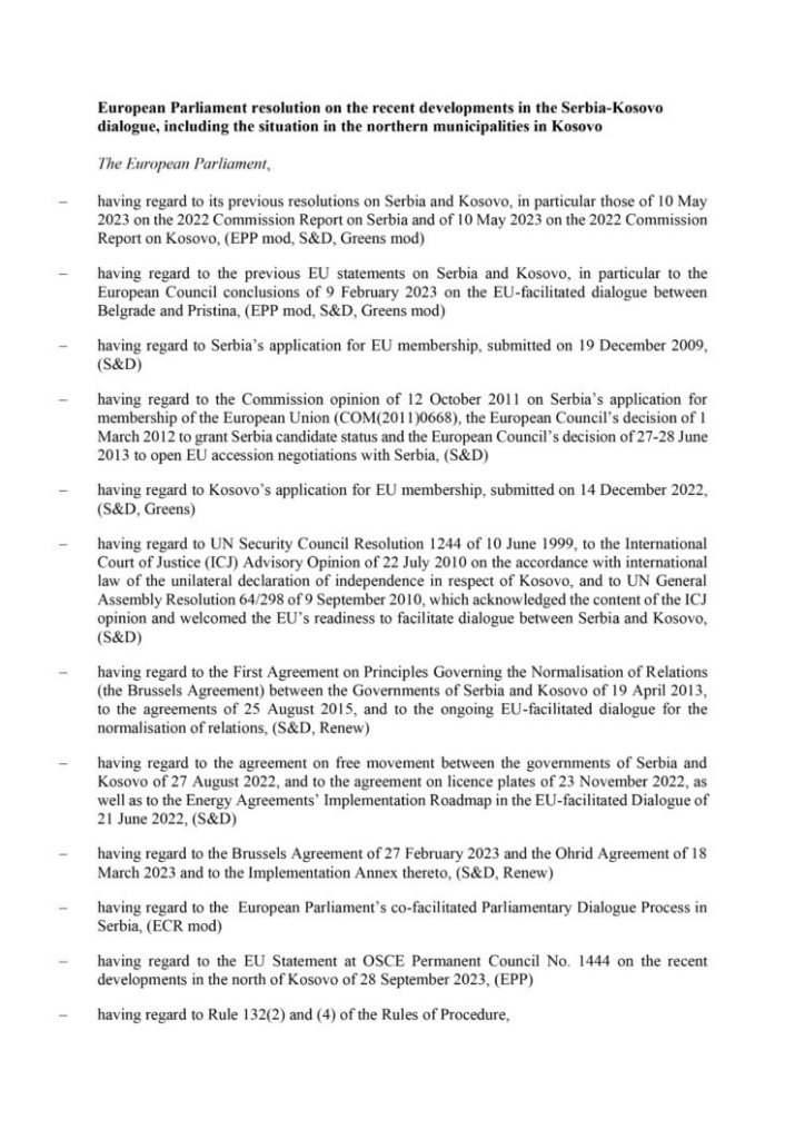 “Të gjitha palët ftohen për qetësim të situatës në veri të Kosovës dhe të shmangin çdo retorikë apo veprim që do të çonte në rritje të mëtejshme të tensioneve. Gjithashtu kërkohet që të vërtetohen të gjitha faktet për sulmin dhe një monitorim i kujdesshëm i hetimeve nga autoritetet kosovare. BE-së i kërkohet të mbështesë hetimin nga autoritetet e Kosovës, duke përfshirë mbështetjen nga EULEX-i. Autorët përgjegjës për këto sulme duhet të mbajnë përgjegjësi dhe të përballen me drejtësinë. Autoriteteve të Kosovës u kërkohet të zbulojnë të gjitha provat në lidhje me incidentin dhe që institucionet ndërkombëtare në Kosovë, përfshirë EULEX-in, t’i vlerësojnë këto dëshmi. Pritet që Serbia të bashkëpunojë plotësisht me këtë hetim dhe të sjellë para drejtësisë përgjegjësit për sulmin dhe që aktualisht ndodhen në Serbi, në përputhje me ligjin, përfshirë ekstradimin e tyre në Kosovë”, thuhet në Rezolutë, raporton RTK.