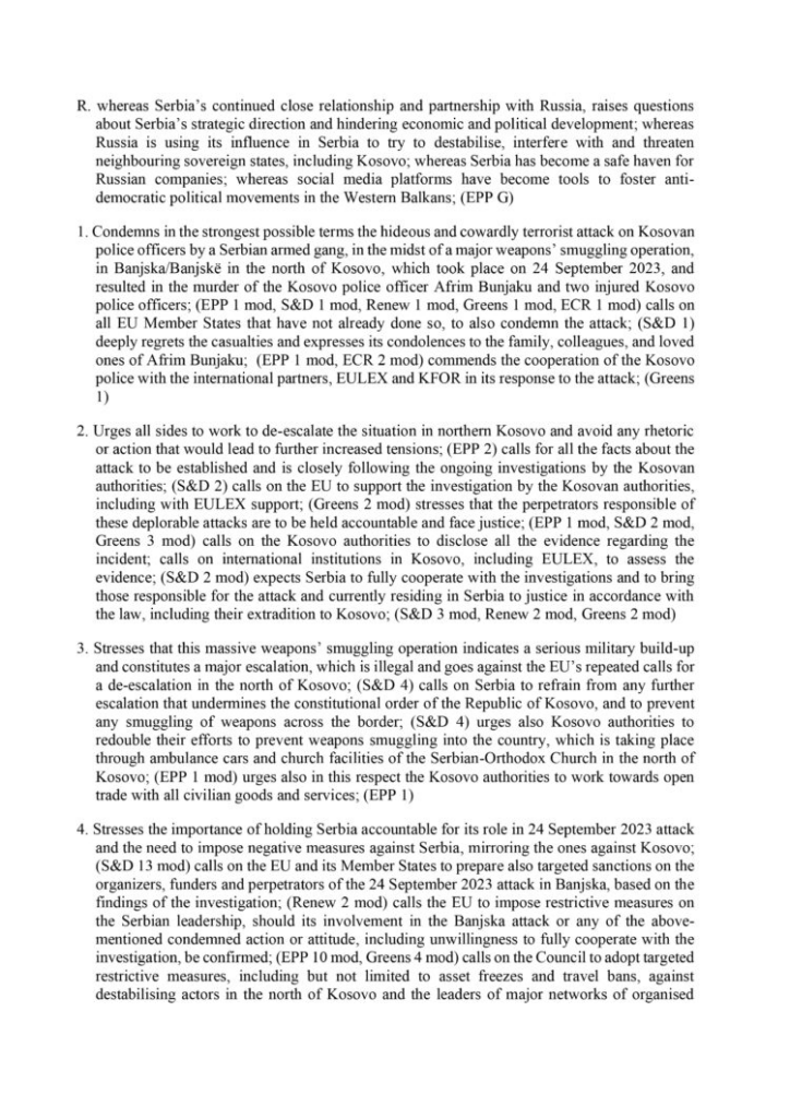Tutje në Projekt-Rezolutë theksohet rëndësia e vendosjes së përgjegjësisë së Serbisë në sulmin e 24 shtatorit dhe nevoja për vendosjen e sanksioneve kundër Serbisë, në përputhje me masat ndaj Kosovës. Ftohen BE-ja dhe anëtarët e saj të përgatisin sanksione kundër organizatorëve, financuesve dhe autorëve të sulmit të 24 shtatorit 2023 në Banjskë, bazuar në gjetjet e hetimit.