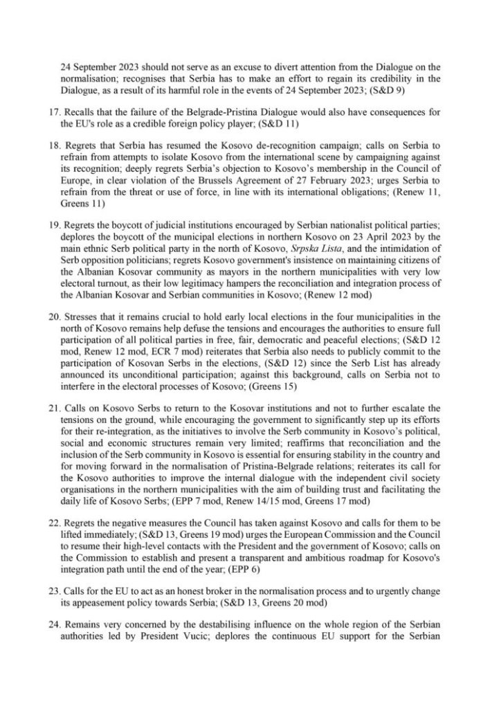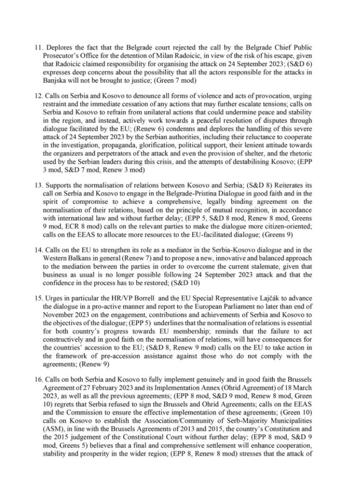 Gjithashtu, BE-së i kërkohet të vendosë masa kufizuese ndaj lidershipit serb, nëse konfirmohet pjesëmarrja e tyre në sulmin në Banjska ose cilido nga veprimet apo qëndrimet e lartpërmendura të dënuara, përfshirë mosgatishmërinë për të bashkëpunuar plotësisht në hetimin e këtij rasti. Këshillit të Evropës i kërkohet të miratojë masa kufizuese të synuara, duke përfshirë, por pa u kufizuar në ngrirjen e aseteve dhe ndalimin e udhëtimit, kundër aktorëve destabilizues në veri të Kosovës dhe udhëheqësve të rrjeteve kryesore të krimit të organizuar. Në këtë kontekst, Këshilli ftohet të ndjekë shembullin e Shteteve të Bashkuara dhe të vendosë sanksione kundër Milan Radojiçiqit.