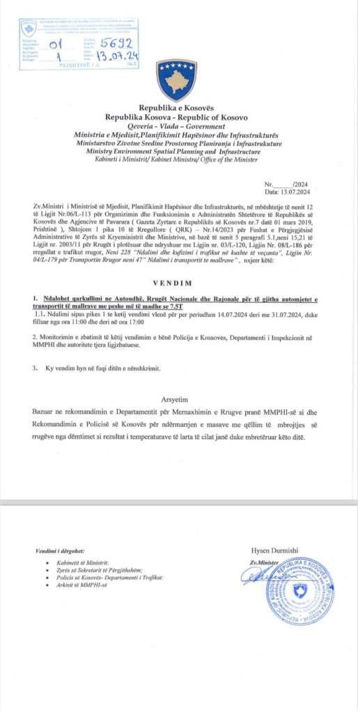 Zëvendësministri, Hysen Durmishi ka bërë të ditur se bazuar në rekomandimet e Departamentit për Menaxhimin e Rrugëve dhe Policisë së Kosovës, me qëllim të ruajtjes së rrugëve nga dëmtimet si rezultat i temperaturave të larta kemi marrë vendim: