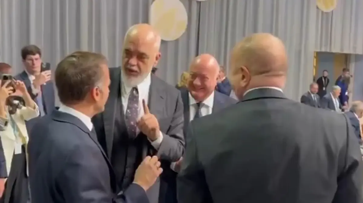 Në pamjet që po qarkullojnë, shihet kryeministri i Shqipërisë, Edi Rama, duke i drejtuar një batutë presidentit francez, Emmanuel Macron, ku rikujton disa nga gafat e presidentit amerikan, Donald Trump.