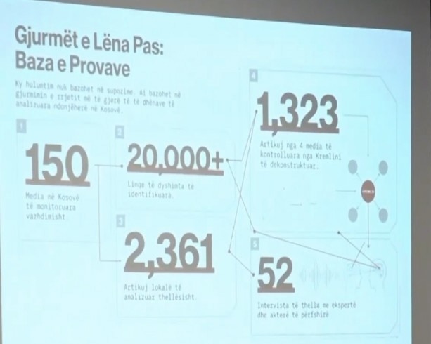 “Janë identifikuar fillimisht 20 mijë linçe të dyshimta, që kanë përmbajtur mostra që ne i kemi pasur target, prej tyre 2361 janë analizuar në mënyrë të thellë për përmbajtjen dezinformuese të Kremlinit në vendin tonë. Elementi tjetër që është analizuar janë edhe 1323 lajme që janë publikuar prej medieve të Kremtimit në vendin tonë. Pra, janë publikuar jo në gjuhën ruse, por edhe në gjuhën shqipe edhe në gjuhën serbe. Pra, më pak se 6 muaj për Kosovën janë prodhuar 1323 artikuj të financuar me mjetet e qeverisë ruse” , tregoi ndër të tjera ai.