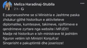 Ish-ministrja e Punëve të Jashtme, Meliza Haradinaj Stublla, ka reaguar ndaj Ministrisë së Jashtme ku thotë se ka zhdukur gjithë historikun e aktiviteteve diplomatike nga Webiste i vet, transmeton Kosova Post.
