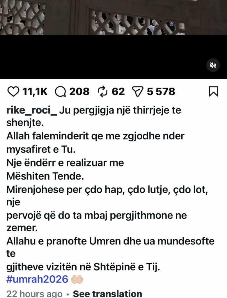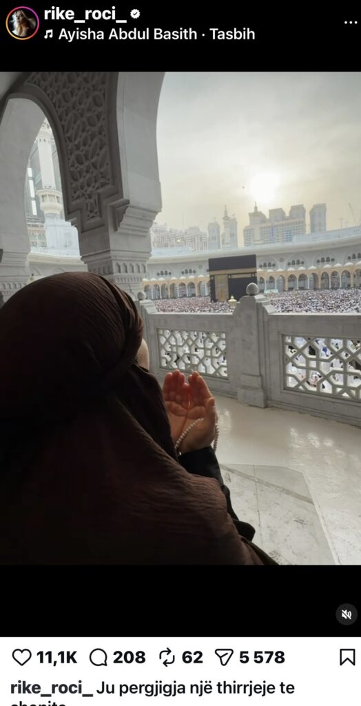 Rike Roci ka zgjedhur të ndajë me ndjekësit e saj një nga momentet më personale dhe shpirtërore të jetës, duke lënë përkohësisht mënjanë jetën publike dhe angazhimet në botën e showbiz-it për një udhëtim të veçantë në Mekë.