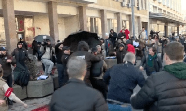 Para ndërtesës së Komunës së Beogradit, një grup qytetarësh dhe politikanë të mbledhur kanë hedhur vezë dhe ngjyrë të kuqe në objekt.