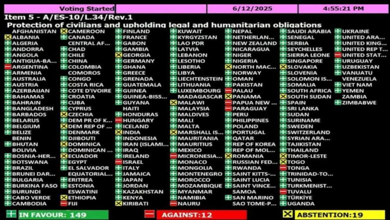 Votimi në Asamblenë e Përgjithshme me 193 anëtarë përfundoi me 149 vota “pro”, 12 “kundër” dhe 19 abstenime, përfshirë Maqedoninë e Veriut, e cila, së bashku me Shqipërinë, ishin të vetmit vend në rajon që nuk votuan “pro” rezolutës. Rezultati i votimit u prit me duartrokitje të zjarrta në sallë.