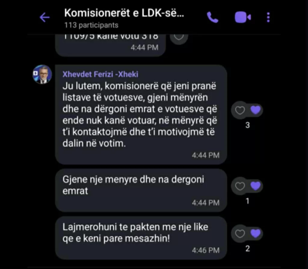 Gjatë ditës së zgjedhjeve komunale në Kosovë, një komunikim i brendshëm i përfolur nga radhët e Lidhjes Demokratike të Kosovës (LDK) në Mitrovicë ka ngritur dyshime serioze për shkelje të rregullave zgjedhore dhe cenim të fshehtësisë së votës. Një bisedë e publikuar nga grupi në Messenger me emrin “Komisionerët e LDK-së” tregon për përpjekje të mundshme për të ndikuar në procesin e votimit.