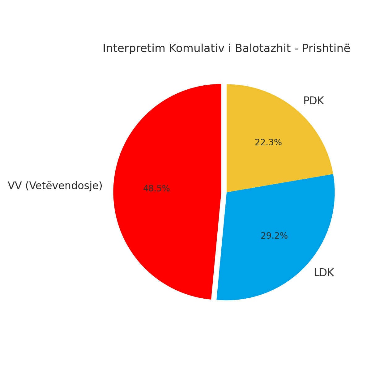 Këto të dhëna përqindjesh të partive politike për zgjedhjet lokale tregojnë një tendencë ku Vetëvendosja (LVV) kryeson me 44.2% në nivel total, duke marrë një preponderancë krahasuar me partitë e tjera si PDK (21.3%), LDK (19.4%), AAK (10.6%), Alternativa (8.4%), GUXO (7.2%), NISMA (4.2%) dhe PSD (1.8%).Sipas konceptit kumulativ dhe në bazë të komuna-ve dhe respondentëve të sondazhit:Në Prishtinë, gara kryesore është midis LDK dhe LVV, ku LDK ka ndikim të fortë lokal, ndoshta duke sfiduar dominuarën e LVV në këtë komunë kryesore.