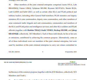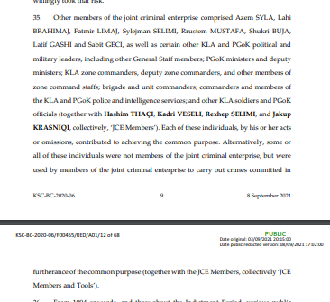 ”Anëtarë të tjerë të ndërmarrjes së përbashkët kriminale ishin Azem SYLA, Lahi BRAHIMAJ, Fatmir LIMAJ, Sylejman SELIMI, Rrustem MUSTAFA, Shukri BUJA, Latif GASHI dhe Sabit GECI, si dhe disa drejtues të tjerë politikë dhe ushtarakë të UÇK-së dhe PGoK-së, përfshirë anëtarë të tjerë të Shtabit të Përgjithshëm. ; ministrat dhe zëvendësministrat e PGoK-së; Komandantët e zonave të UÇK-së, zëvendëskomandantët e zonave dhe anëtarët e tjerë të shtabit komandues të zonës; komandantët e brigadës dhe njësive; komandantët dhe pjesëtarët e policisë dhe shërbimeve inteligjente të UÇK-së dhe PGoK-së; dhe ushtarë të tjerë të UÇK-së dhe zyrtarë të PGoK-së (së bashku me Hashim THAÇIN, Kadri VESELI, Rexhep SELIMI dhe Jakup KRASNIQI, kolektivisht, ‘Anëtarët e NPK’). Secili prej këtyre individëve, me veprimet ose mosveprimet e tij ose të saj, kontribuoi në arritjen e qëllimit të përbashkët”, pretendon organi i akuzës.