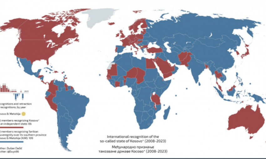 Great map @Duyo96. The world is turning blue day by day. The moral is when you pursue a unilateral declaration of independence like #Kosovo*, the recognition process is shaky and reversible by default. Many thanks to non-recognizers and retractors, intl law will prevail! 🇺🇳 pic.twitter.com/j5sWnNAtPB