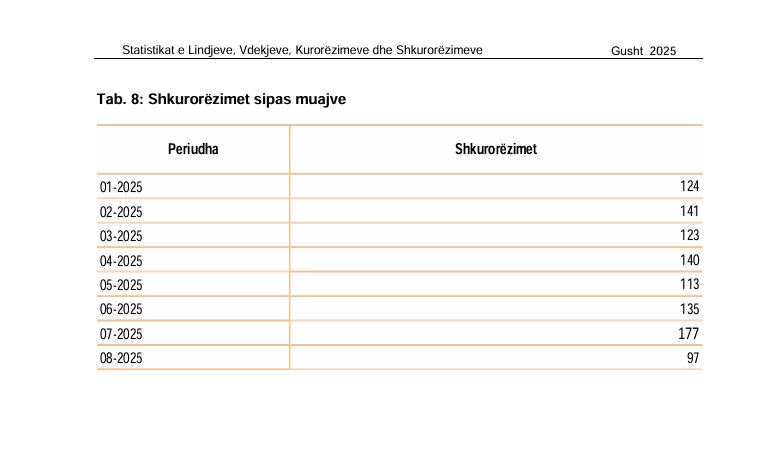 “Ndërsa sa i përket shkurorëzimeve të ndodhura ë Kosovë për muajin Gusht janë 97 raste, krahasuar me muajin Korrik kemi rënie të numrit të çifteve të shkurorëzuarve për (45.2 %)”, thuhet në raportin e ASK-së, trasnsmeron KosovaPost.