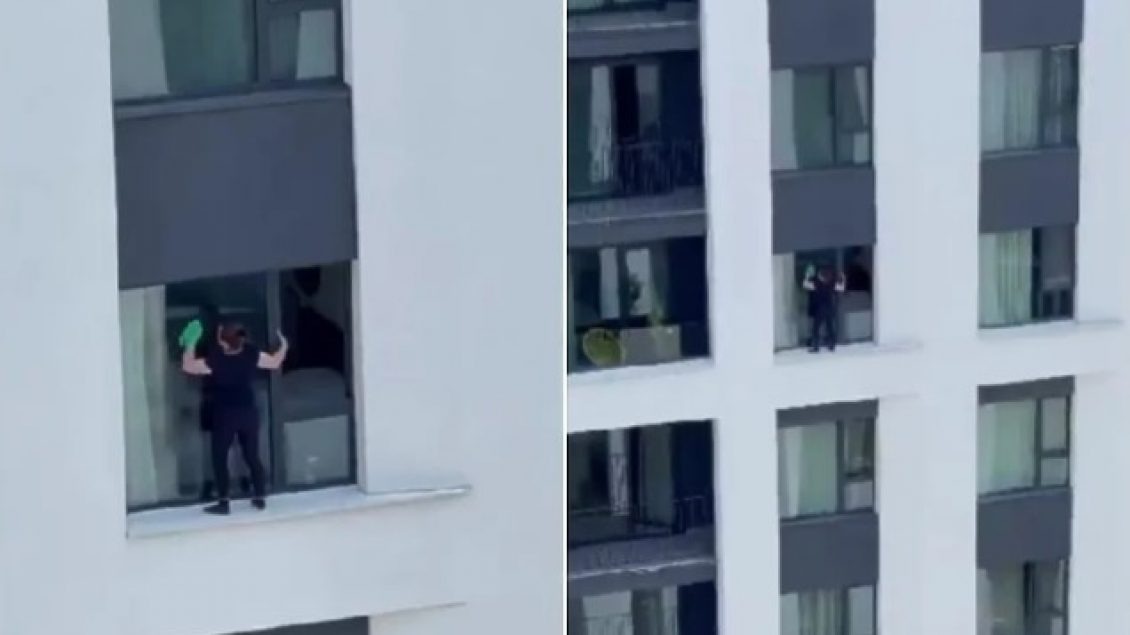 Një video e çuditshme e një gruaje duke larë dritaret në katin e 10-të të një ndërtese në një lagje të Beogradit është shfaqur në Twitter.