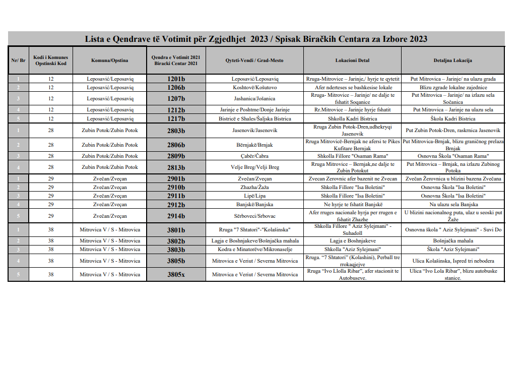 Komisioni Qendror i Zgjedhjeve (KQZ) publikoi listën e qendrave të votimit dhe lokacionet e tyre për zgjedhjet e jashtëzakonshme për kryetar në katër komunat Mitrovicë e Veriut, Zveçan, Leposaviq dhe Zubin Potok si dhe për zgjedhjet e parakohshme për dy kuvendet komunale Zveçan dhe Leposaviq, të cilat do të mbahen më 23 prill 2023.